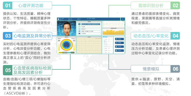 沃克醫(yī)生智能雙心分析評測系統(tǒng)是清易云康自主研發(fā)的一款通過現(xiàn)代人工智能技術(shù)對患者進(jìn)行“雙心”(心理+生理指標(biāo))分析評測的智能化系統(tǒng)。主要應(yīng)用于當(dāng)患者出現(xiàn)“心”里不適時(shí),系統(tǒng)可有效快速的篩查被測試者是否存在心理問題。同時(shí)通過評測篩查確定患者病因是屬于生理因素還是心理因素,為醫(yī)生給患者做更合適的生理或心理治療提供醫(yī)學(xué)依據(jù),同事結(jié)合面部分析、生理情緒指標(biāo)等客觀參數(shù)有效增強(qiáng)分析評測的準(zhǔn)確性和實(shí)用性。